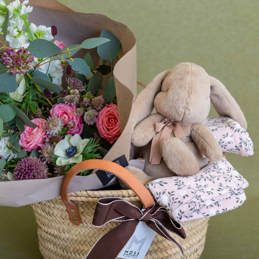 Capazo con flores y muñeco I recién nacido