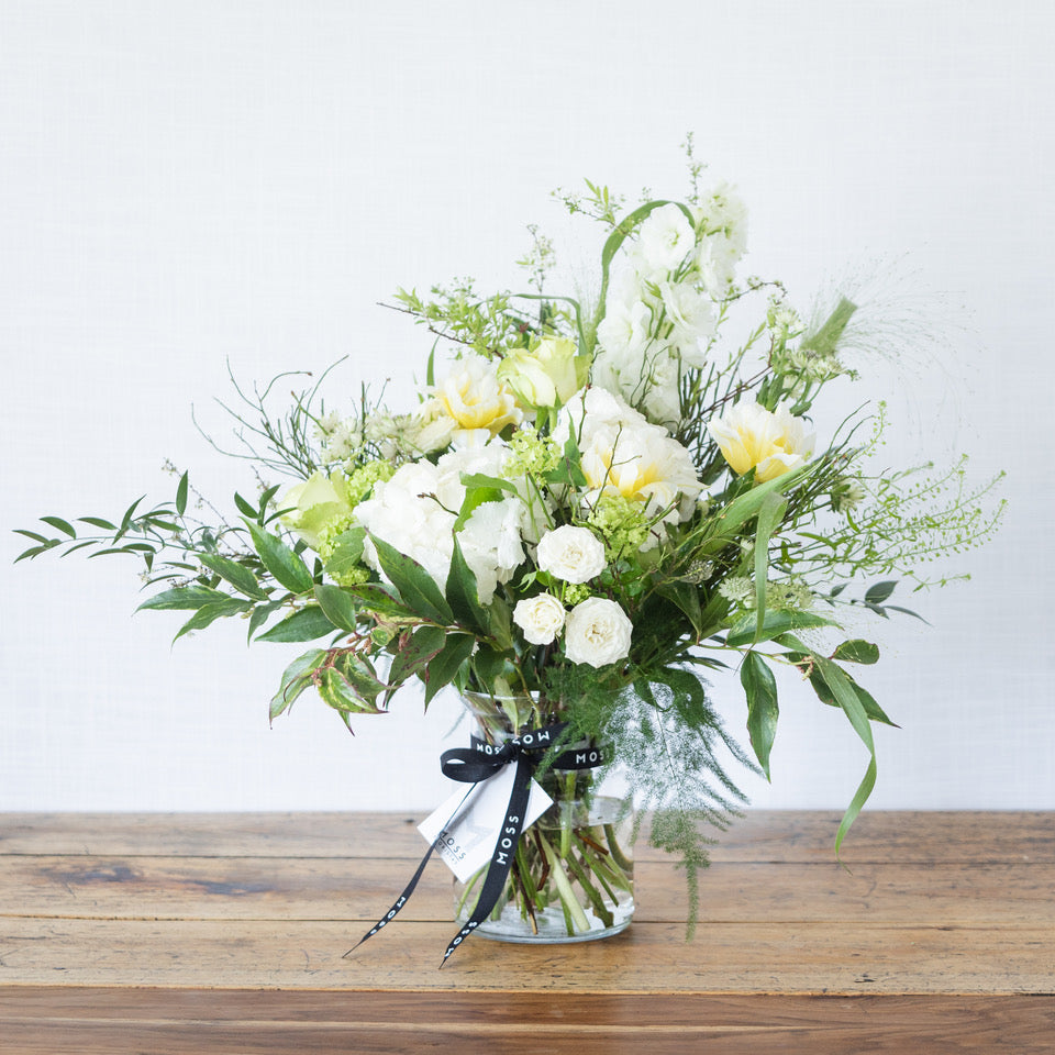 Fresh and soft combination of green and white flowers presented in a recycled glass vase with a rustic look.