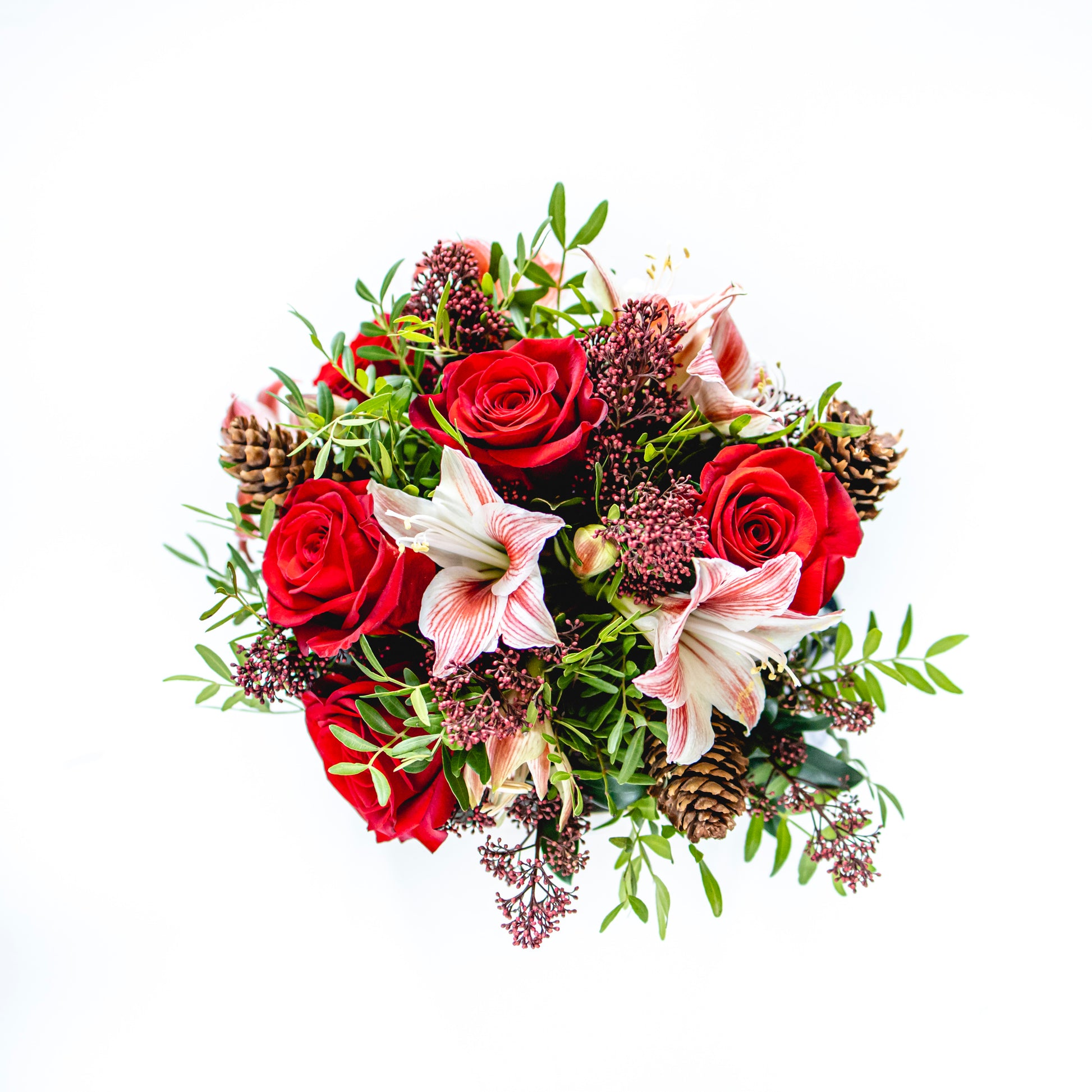 Bolsa de Flores Moss Noel, un elegante detalle navideño elaborado con una cuidada selección de flores de temporada. Ideal como regalo de agradecimiento para llevar a cenas y reuniones en estas fechas festivas. Su diseño compacto y sofisticado, con medidas aproximadas de 30 cm de alto y 20 cm de ancho, la convierte en un obsequio perfecto para sorprender y transmitir calidez en Navidad.