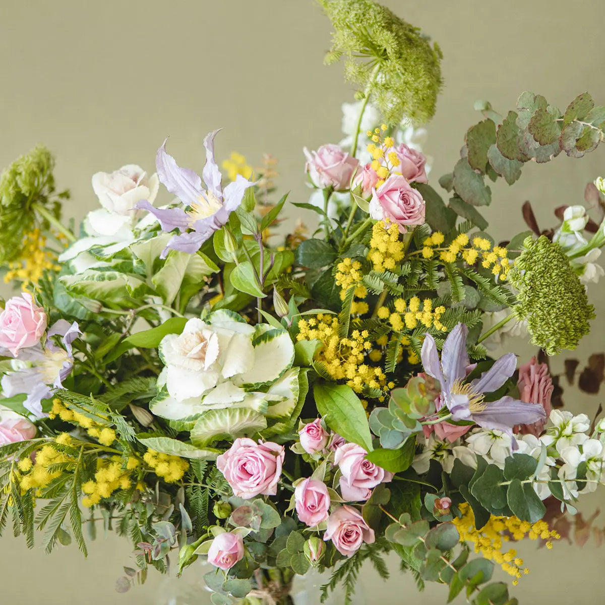 Centro mediano de composición asilvestrada con flores pequeñas de temporada en tonos pastel empolvados.