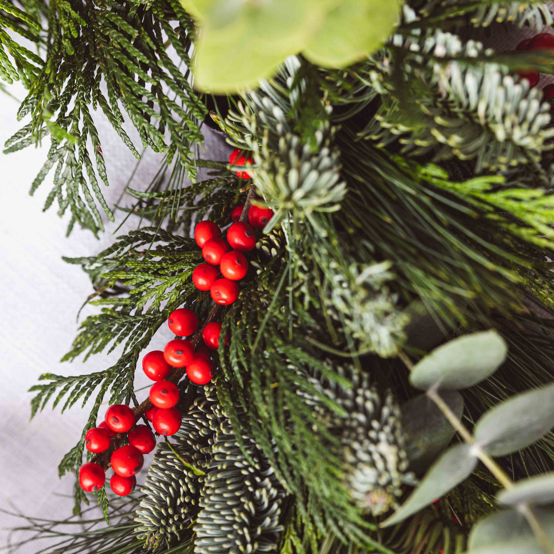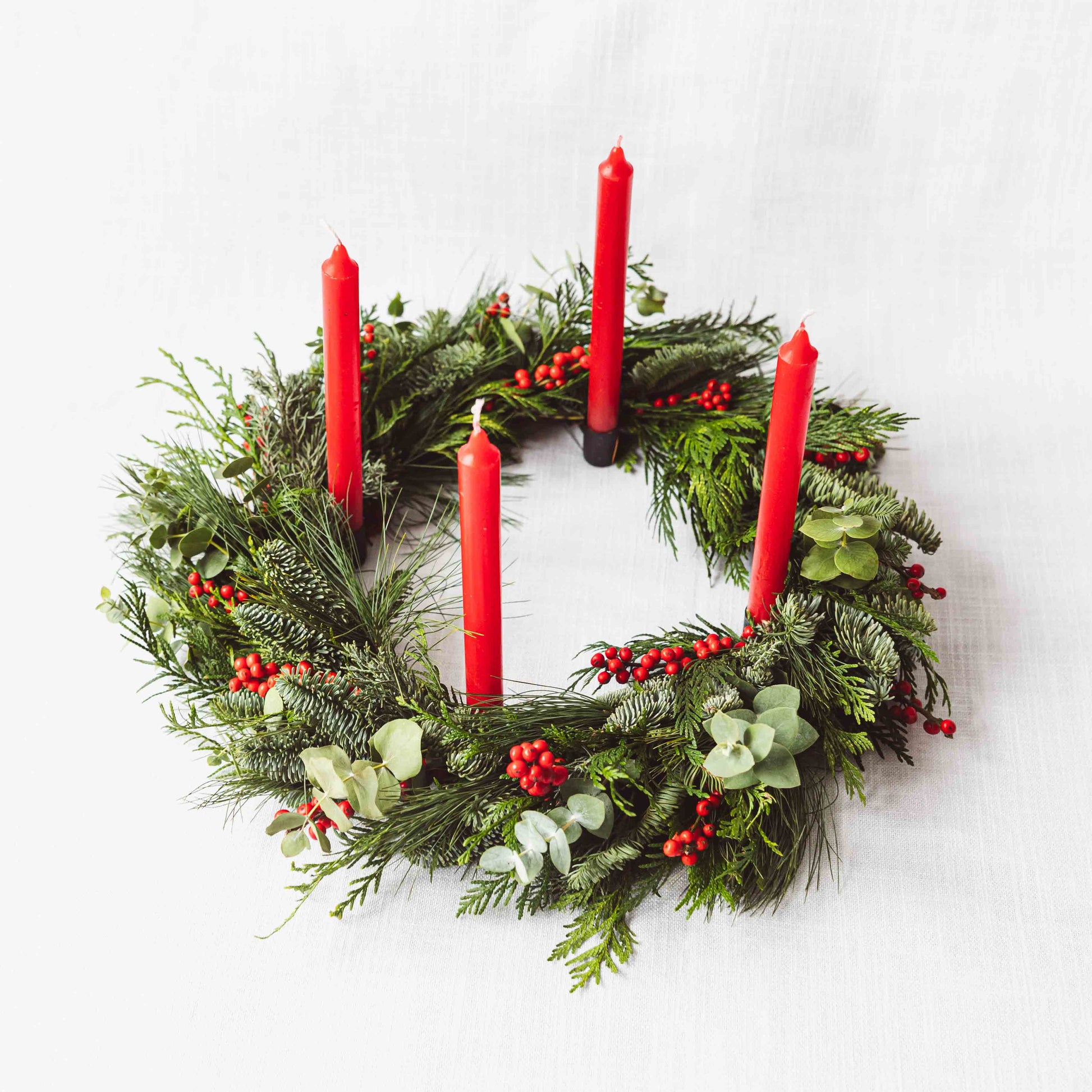 Corona de Adviento, una pieza única elaborada sobre un robusto bastidor de hierro con un portavelas estable de 38 cm de diámetro. Confeccionada con fragantes ramajes de abeto, pino, ciprés, tuya y eucalipto, esta corona se presenta en tres opciones diferentes para adaptarse a tu estilo. Perfecta para decorar tu hogar con calidez y tradición durante la temporada navideña.