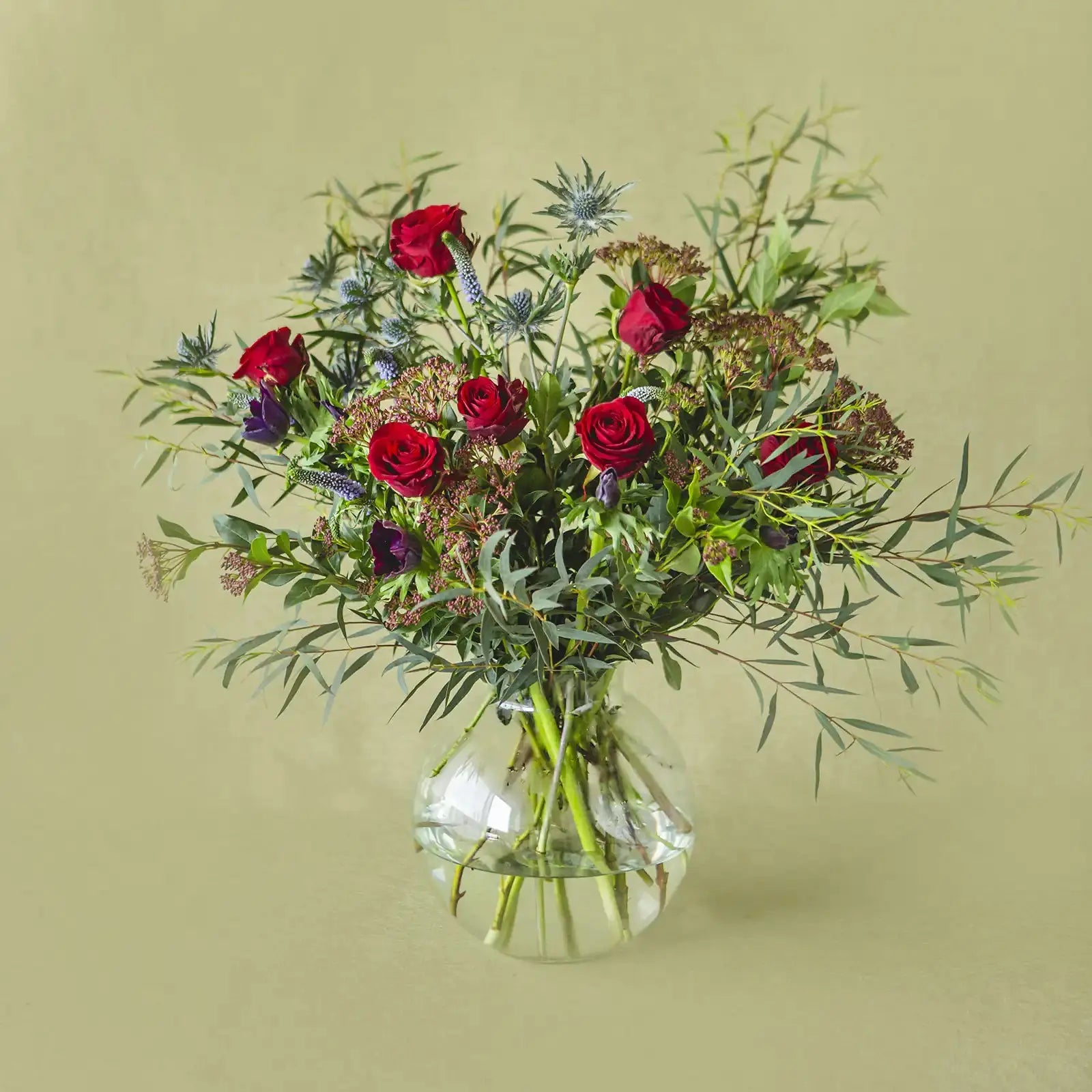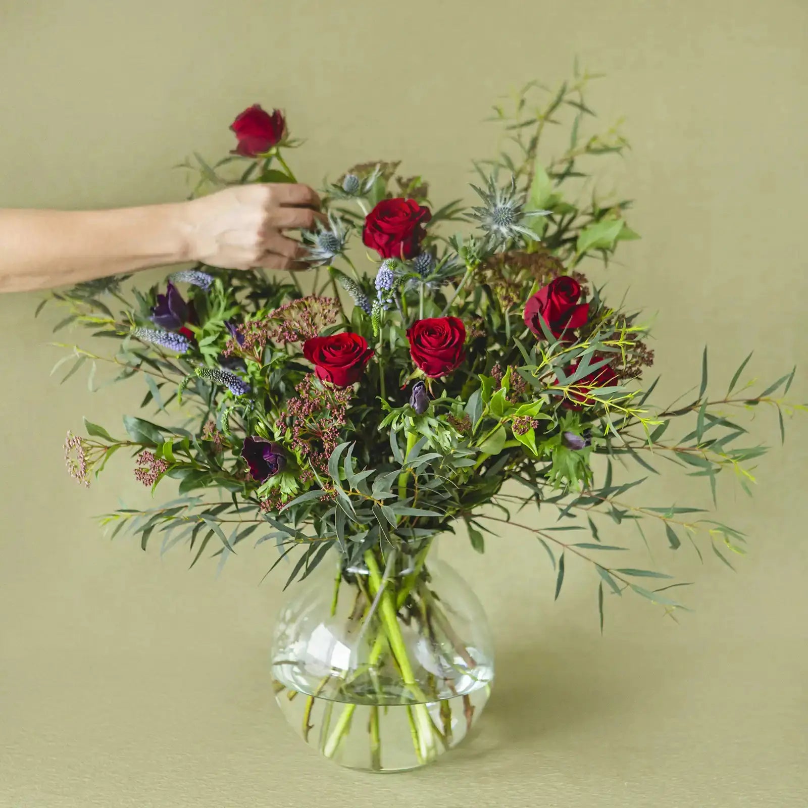 - El número de tallos de verdes y flores estará siempre entre 20-30 y variará en función de la importancia y precio de cada tipo, pero siempre estará seleccionada para que se pueda componer un arreglo floral completo para jarrón mediano.
