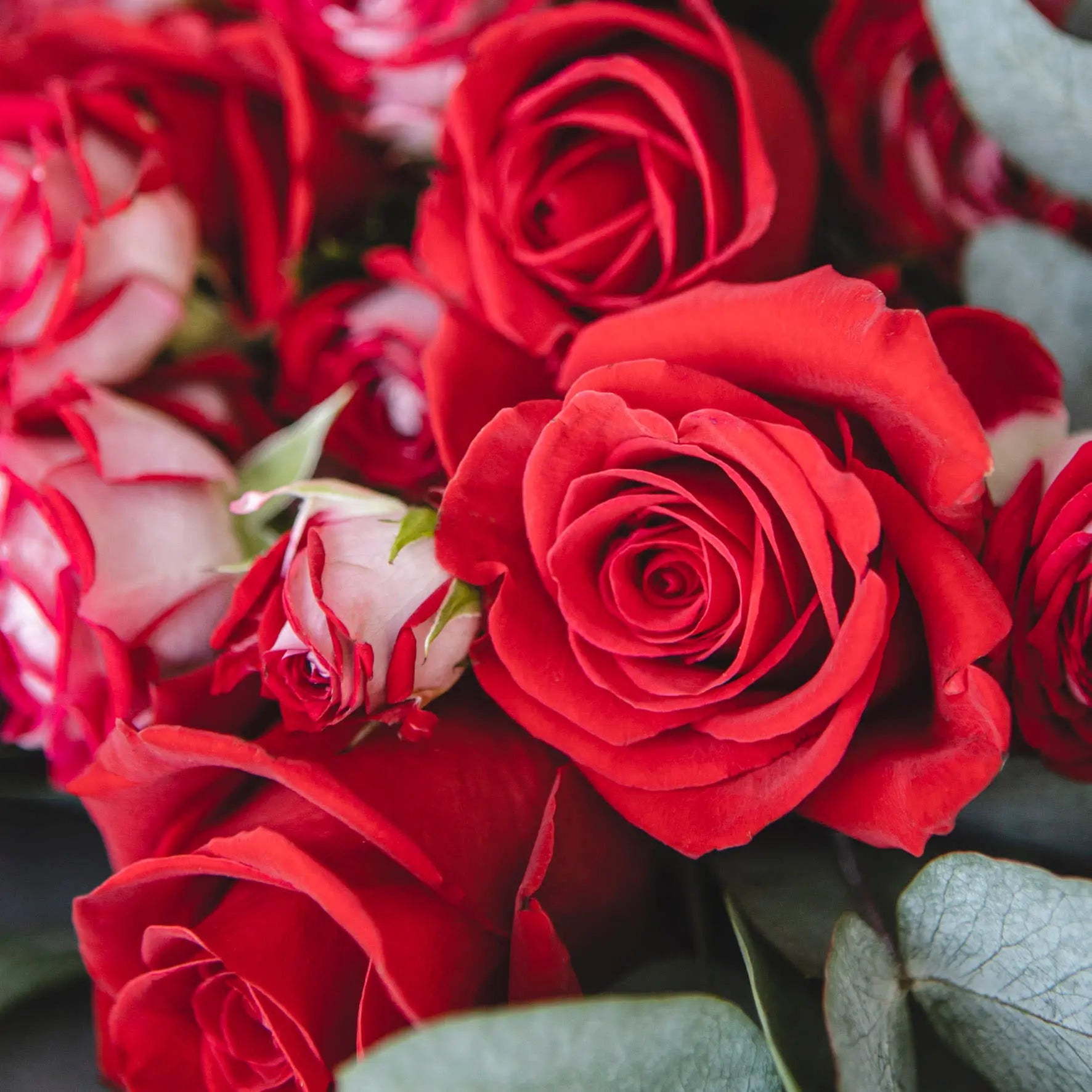 Ramo de formato pequeño elaborado con rosas rojas simples y ramificadas y ligeros toques de verdes, presentado en cucurucho de papel y papel seda.